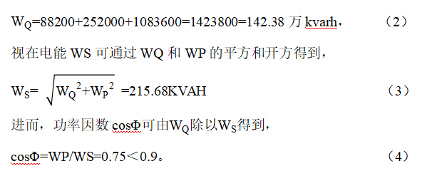 在间隔413处,有功负荷长期稳定在0.5-1MW区间,三个月累计吸收的有功电量约为WP=750*24*90=2160000KWh,即162万KWh。在计算功率因数时,所涉及的无功电量包括从电网流向用户的无功电量绝对值与从用户流向电网的无功电量绝对值之和。因此,参与计算的总无功电量为: