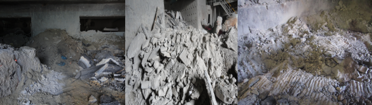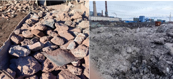 图:伊钢钢包拆除废弃的镁碳砖 图:混入废弃耐材的钢渣 图:钢渣中人工挑拣出的废弃耐火材料