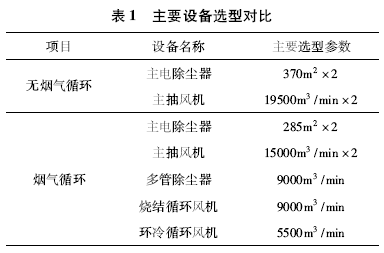 某钢厂烧结烟气循环系统,采用内循环工艺,将烟道分为了脱硫烟道和循环烟道,需要末端治理的风量减少,脱硫烟道相比未采用烟气循环设计风量减少9000m3 /min,主抽风机选型功率减小1800kW,但是烧结烟气循环增加了烧结循环风机和环冷循环风机4200kW,总的风机投入增加2400kW。对比有烟气循环时和无烟气循环时主要设备选型的对比如表1 所示。