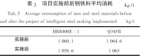 由表3 可知,智能炼钢项目实施以后,两个钢种钢铁料消耗均有不同程度降低,降幅平均达1. 5kg /t,应用效果明显,经济效益显著。