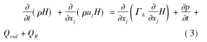式中,H 是包括动能的总热焓,J; Q rad 和 QR分别为辐射与化学反应热源项,Γ h 表示热交换系数。