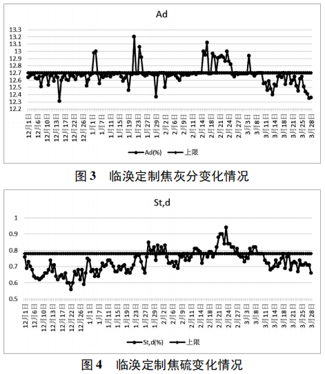 临涣定制焦质量劣化。2018 年 1 月份下旬开始,临涣定制炭质量明显劣化,焦炭灰分、硫分出现明显升高,连续出现不合格批次。1 月 24 日灰分超标,2 月 16 - 24 日灰分持续超标( 见图 3) ; 1 月29 日 - 2 月 3 日硫持续超标,2 月 21 日 - 3 月 8 日硫频繁超标( 见图 4) ,随后 2 月下旬炉况下滑,风量逐步萎缩至 4 200 - 4 300 m3/min。