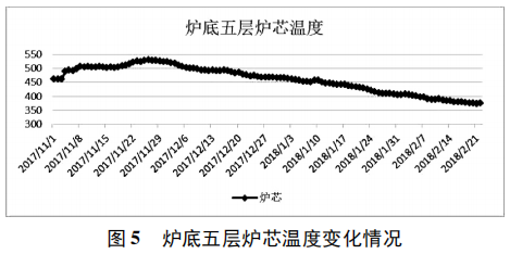 调整负荷。根据炉况下滑的程度,将全焦负荷由 4. 59 逐步退至 4. 20,但气流稳定性依然较差,墙体温度波动大,炉内主要体现在风压波动,加减风较为频繁,炉温可控性差,不易平衡。调整渣系。炉芯温度自去年 11 月 26 日创开炉新高以来,炉芯温度不断下滑( 见图 5) ,说明炉缸中心死料柱透液性在变差,可能存在中心堆积。为此,通过降低核料炉渣碱度使得实际炉渣碱度维持在合理水平,来改善炉缸渣铁的流动性。22 日、24 日、27 日各降核料碱度 0. 01,核料碱度由 1. 16降至 1. 13。