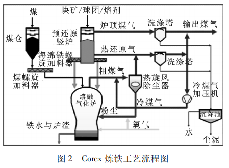 熔融还原炼铁是非高炉炼铁的分支,污染较轻,且几乎不用日益短缺的、昂贵的冶金焦炭,备受全行业关注。其核心是一个还原单元( 进行预还原) 和一个熔炼造气单元( 进行终还原及为还原单元供还原气体) 。目前最受重视的还原设备是竖炉和流化床。竖炉是成熟的还原设备,目前唯一工业化的熔融还原 Corex 就采用竖炉,其工艺流程如图 2 所示[4]。其他的熔融还原炼铁技术有: 韩国在 Corex基础上研发的 FINEX( 可直接使用粉矿和粉煤) 、澳大利亚的 HISMELT 和 AusTXon、日本的 DIOS、处于理论研究 阶 段 的 氢 冶 金 等。依目前实际情况看,Corex,FINEX,HISMELT 工艺开发潜力较大,适应未来社会发展,是钢铁技术竞争的焦点。