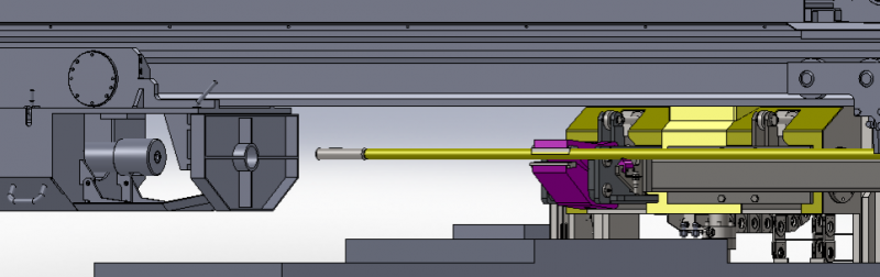 装钎时,活动托架将新钎举到凿岩机钻杆接套中心处,换钎机构的夹钳再夹住新钎,然后开铁口机的小车边前进,凿岩机先反转再正转,钎具拨开钻杆接套里的插销,新钎被装进钻杆接套。装好钎后,换钎机构收缩到位,移动到导轨的另一端。
