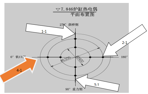 情况分析;3-1、4-1热电偶处于第二代、第三代冷却壁接缝处,此处耐材砌筑厚度750mm、热电偶插深520mm深度,角度处于铁口东西两侧,当前温度与历史最高温度、稳产平均温度相比,均低于此处温度,证明此热电偶范围内碳砖侵蚀正常,属于安全状态;