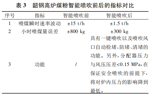 改造实施智能喷吹,喷煤瞬时速率最大波动量由±15 t / h 降低至±1.5 t / h,小时喷煤量误差由±800 kg调整为±300 kg。同时具有一键喷吹以及喷吹风口自动检堵、防堵、清堵的功能,煤粉智能喷吹前后的指标对比见表 3。
