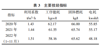 从表 3 可以看出,2022 年比 2020 年利用系数上升0.08 t/m2·h,工序能耗下降 4.01 kgce/t,固体燃耗下降0.38 kg/t,电耗下降 7.67 kwoh/t。