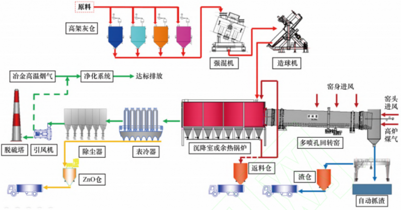 新型回转窑工艺流程主要为:强力混合机→造球机→回转窑(还原)→沉降室或余热锅炉→表面式冷却器→布袋除尘器→湿法脱酸系统等工序,相对于传统回转窑技术,新型回转窑技术在工艺流程上主要新增原料强混+造球工艺,一定程度上参考了转底炉的部分工艺,将粉料进行造球处理,以球团的形式进入窑体。既可以抑制传统粉料进入窑体的扬尘,减少粉料进入烟气中,从而提高次氧化锌的品位。新型回转窑工艺流程如图2所示。