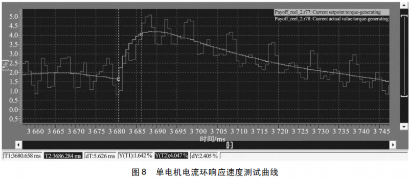 定义 5% 的附加转矩,观察电流环响应速度,阶跃产生到实际电流到达设定的时间,电流环响应时间小于 10 ms。图 8 为单电机电流环响应速度测试曲线。