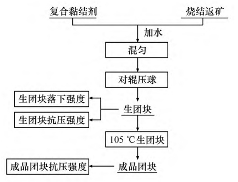 试验包括烧结返矿冷固结团块制备及强度检测和显微形貌分析。返矿冷压团块制备的主要工艺流程如图 1 所示,主要包括配料、混匀、加水搅拌、冷压成块和干燥等步骤。每 组 实 验 采 用LP—C30002型电子天平称取 2 kg 烧结返矿,另配加 4% ( 80 g) 复合黏结剂经 SYH—15 型混料机混合均匀,再加入 100 g( 控制水分 5% ) 水经 B10 型搅拌机搅拌 5 min,采用 TDXM—360 型对辊压球机在辊压 20 MPa、主轴转速 8 r/min 的条件下压制成尺寸为 18 mm × 22 mm × 32 mm 的椭球形团块。得到的生团块在 101—2AB 型电热鼓风干燥箱中于 105 ℃下干燥 12 h 至恒重,得到成品团块。