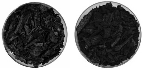 本研究采用的烧结混匀料取自敬业钢铁原料二车间料场大料垛,白灰取自烧结车间配料室,燃料选用无烟煤和生物质炭。生物质炭来自本地某公司生产提供,该生物质炭原料采用树皮、秸秆和锯末等经炭化制成,如图1 所示。