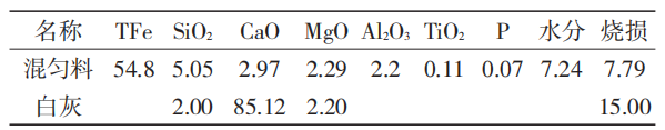 混匀料和白灰成分如表1 所示,燃料的化学成分及工业分析结果见表2,燃料灰分的化学组成见表3,燃料粒度组成见表4。