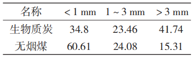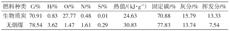 由表2 可知,从化学成分上看,该生物质炭含碳量较无烟煤低7 .63%,生物质炭热值较无烟煤低6.20 kJ/g,而氮元素和硫元素明显较无烟煤含量少,分别比无烟煤低1.13%和0.28%。从工业分析上看,生物质炭的灰分和挥发分分别比无烟煤高2.05%和5 .79%。