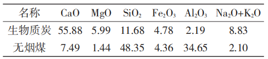 由表3 可知,生物质炭灰分中CaO 和MgO 的总质量分数比SiO2 和Al2O3 的总质量分数高,其灰分呈现碱性;而无烟煤的灰分呈现酸性。并且生物质炭中碱金属钾和钠的含量比无烟煤高6 .73%。