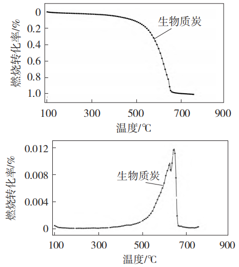 本研究利用热重分析方法对生物质炭燃烧性能分析,生物质炭的燃烧转化率和转化速率曲线如图2 所示。可以看出生物质炭的燃烧反应曲线对应的温度区间要低,同时,生物质炭的燃烧速率峰2个,主要原因是生物质炭中挥发分含量较高,挥发分和固定碳的燃烧过程差距较为明显。