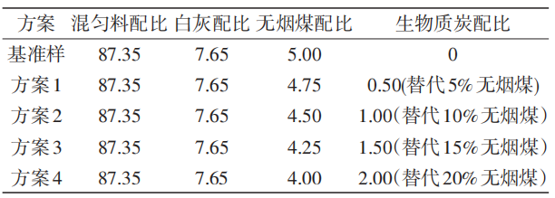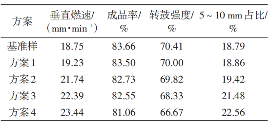 采用质量配料法配料进行烧结杯试验,方案1、方案2、方案3 和方案4 通过用生物质炭替代5%、10%、15%和20%的质量分数的无烟煤进行试验并与基准样进行对比,其中生物质炭与无烟