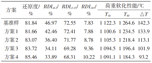 为进一步分析生物质炭对烧结矿冶金性能影响,对各烧结杯方案试验得到的成品烧结矿进行冶金性能试验。