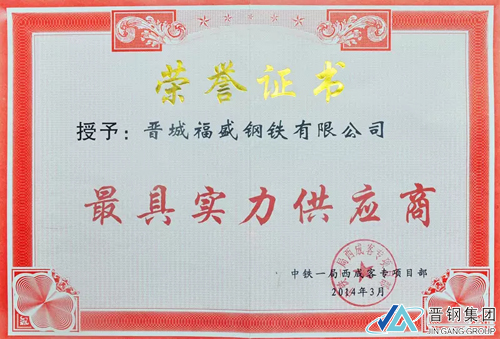 2014年3月,公司凭借过硬的产品质量及周到的供货服务,赢得了西成客专项目部及施工单位的一致好评,被中铁一局西成客专项目部授予“最具实力供应商”荣誉称号。自2013年4月合作以来,公司为该项目提供了大量的优质钢材,产品质量和服务质量深受客户认可,晋钢产品的使用有效地保证了工程质量及施工进度。