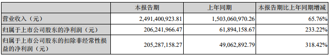 常宝股份8月23日晚发布2018年半年报。报告期内,公司共实现营业收入24.91亿元,同比增长65.76%;实现归属于上市公司股东净利润为2.06亿元,同比增长233.22%。
