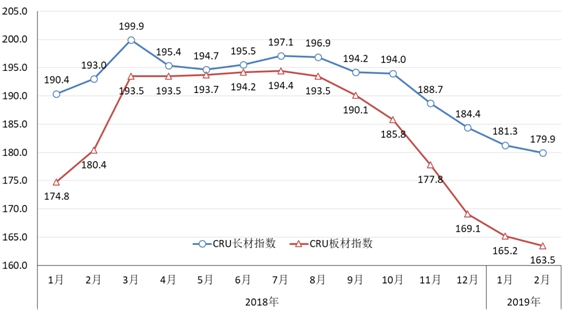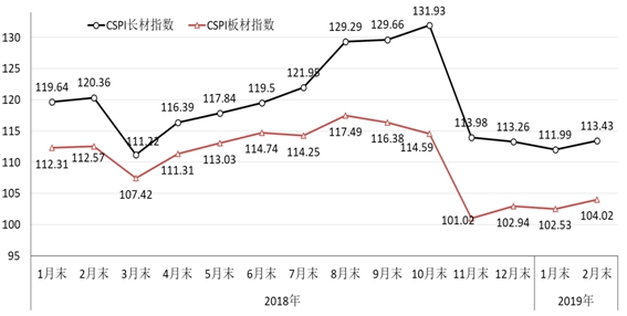 2月末,CSPI长材指数为113.43点,环比上升1.44点,升幅为1.29%;CSPI板材指数为104.02点,环比上升1.49点,升幅为1.45%,比长材价格升幅高0.16个百分点;与去年同期相比,长材价格指数下降6.93点,降幅为5.76%;板材价格指数下降8.55点,降幅为7.60%。(见下图、表)
