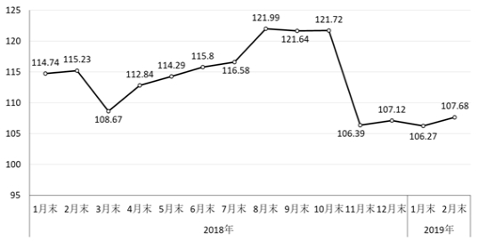 2月末,钢铁协会CSPI中国钢材价格指数为107.68点,环比上升1.41点,升幅为1.33%;同比下降7.55点,降幅为6.55%。(见下图)