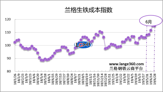 从图1兰格生铁成本指数走势图可以看出,2019年6月份的生铁成本指数呈震荡上行走势,由月初的108.4点升至月末的115.1点,均值较上月上升5.6%。
