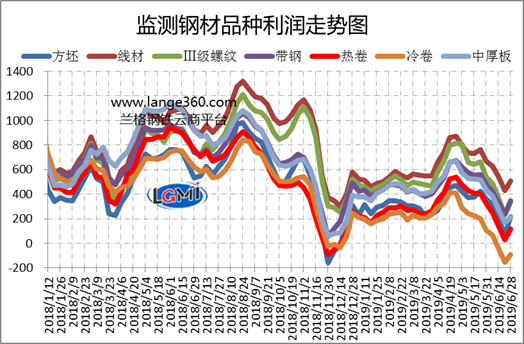 图2是兰格钢铁云商平台监测的各主要钢材品种的盈利能力曲线对比。从图2可以看出, 6月份7大品种测算毛利呈先降后升态势,各品种平均毛利较上月下降191-305元/吨;其中螺纹钢毛利下降最多,为305元/吨;钢坯毛利下降最少,为191元/吨;其他品种盈利下降幅度在213-274元/吨之间。成本明显上升、钢价小幅下行,使得6月份钢企盈利空间显著收缩。