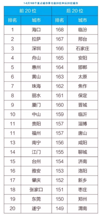 2019年上半年全国空气质量状况:临汾、邢台、石家庄位列后三位