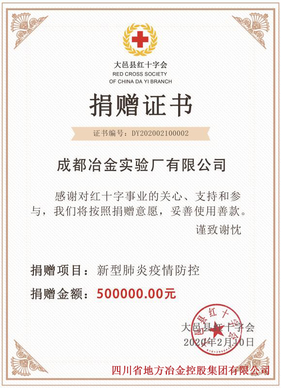 2月10日,冶控集团大邑基地成都冶金实验厂有限公司向大邑县红十字会捐赠人民币50万元,专项用于支援新冠肺炎疫情防控工作的开展。