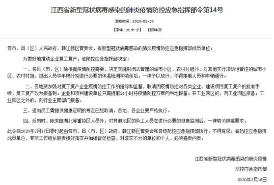据了解,为更好地推动企业复工复产,江西省防控应急指挥部作出如下决定:
