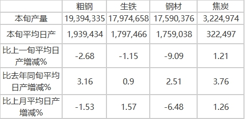 根据重点统计企业钢铁产量估算,本旬全国共生产粗钢2656.71万吨,日产粗钢261.31万吨,环比下降2.18%、同比增长8.67%;生产生铁2154.15万吨,日产生铁221.56万吨,环比下降0.85%、同比增长5.62%;生产钢材3339.98万吨,日产钢材309.62万吨,环比下降7.64%、同比增长5.65%。