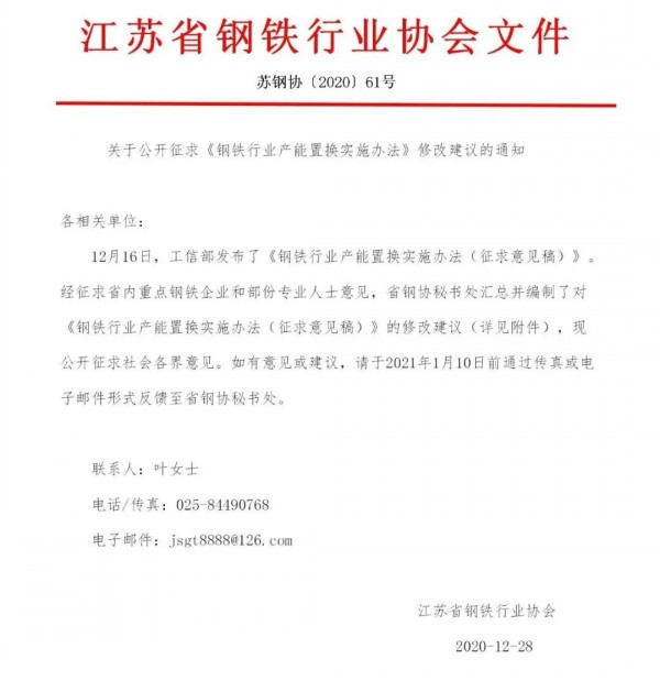 核心提示:《钢铁行业产能置换实施办法(征求意见搞)》的修改建议 发表日期:2020-12-30 7:52:23 江苏省钢铁行业协会 (江苏