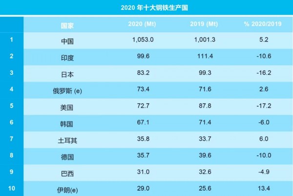 据世界钢协统计,2020年,全球粗钢产量达到18.64亿吨,同比下降0.9%。