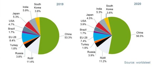 2020年,中国粗钢产量达到10.53亿吨,同比提高5.2%。中国粗钢产量占全球粗钢产量的份额,由2019年53.3%上升到2020年的56.5%。