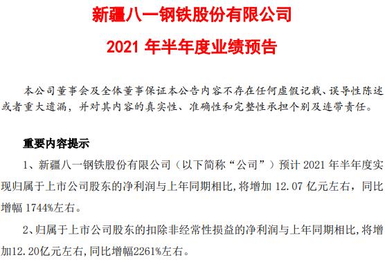 八一钢铁预计上半年归属于上市公司股东的扣除非经常性损益的净利润与上年同期相比,将增加12.20亿元左右,同比增幅2261%左右。