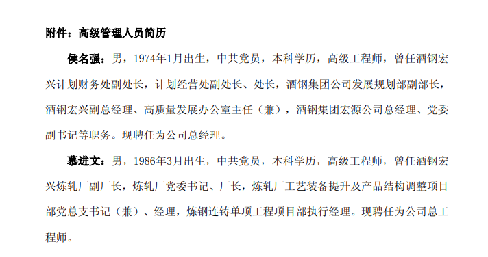 日前,甘肃酒钢集团宏兴钢铁股份有限公司发布“关于聘任部分高级管理人员的公告”称,为保障公司治理机制的良性运转,经董事长秦俊山先生提名,提名委员会审查通过,