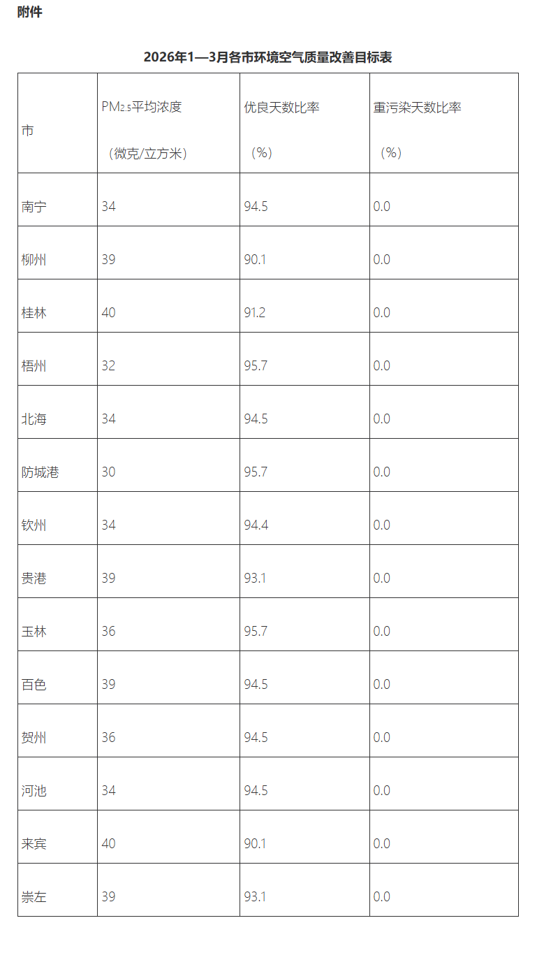 2026年1—3月,全区PM2.5平均浓度控制在36微克/立方米以下,优良天数比率达到93.7%,各市城市环境空气质量持续改善(具体改善目标见附件);全区PM10、O3平均浓度分别控制在56、111微克/立方米以下。
