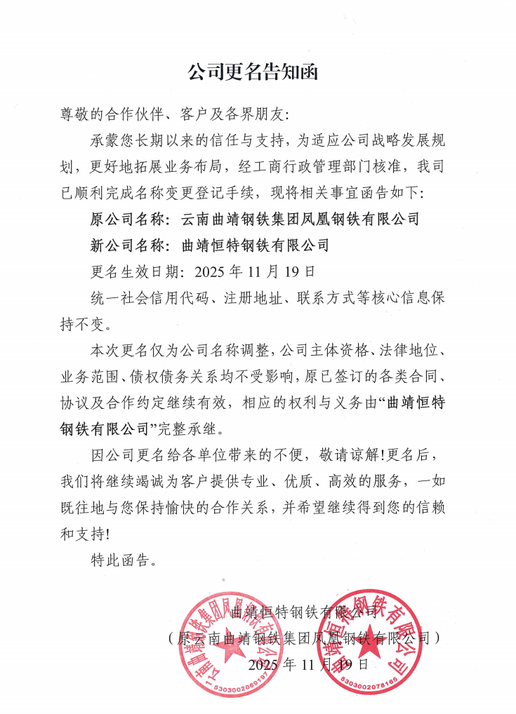 告知函!云南曲靖钢铁集团凤凰钢铁有限公司正式更名为曲靖恒特钢铁有限公司