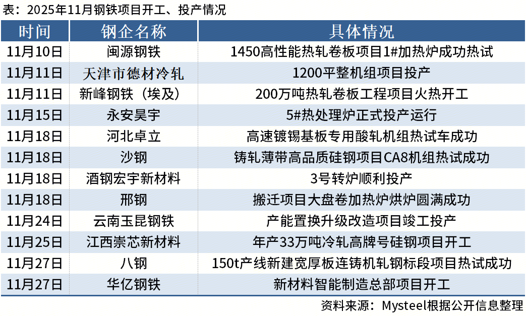 不完全整理,2025年11月份有12个钢铁项目开工或投产。其中,新峰钢铁(埃及)、江西崇芯新材料等项目开工;天津市德材