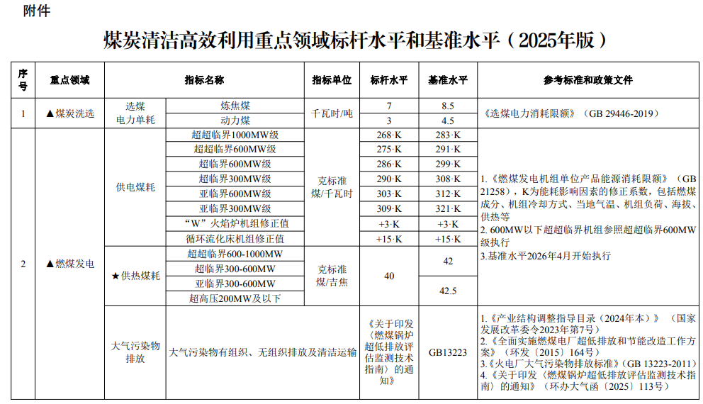 为贯彻落实党中央、国务院决策部署,推动煤炭产业由低端向高端、煤炭产品由初级燃料向高价值产品攀升,按照《国家发展改革委等部门关于加强煤炭清洁高效利用的意见》(发改运行〔2024〕1345号),经商有关方面,现发布《煤炭清洁高效利用重点领域标杆水平和基准水平(2025年版)》,并就有关事项通知如下。