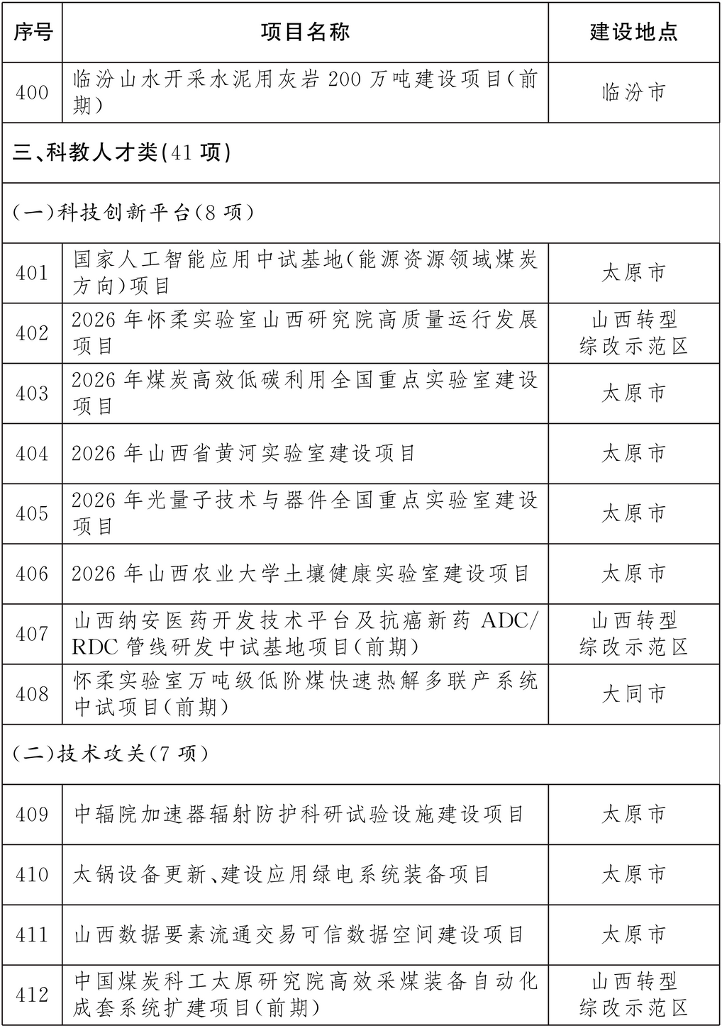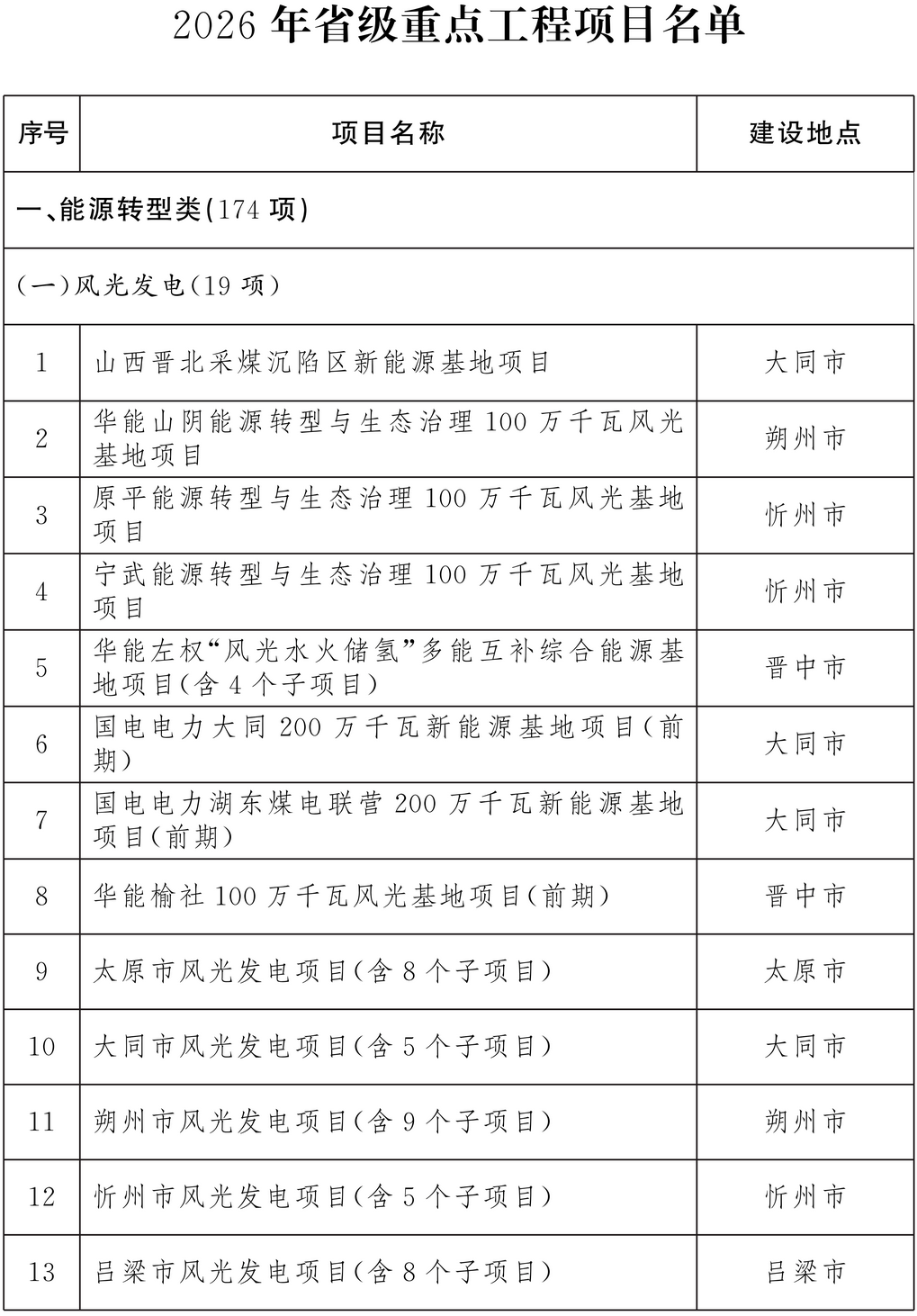 1月5日,山西省人民政府发布2026年省级重点工程项目名单,共629个项目,其中能源转型类项目174个、产业升级类项目226个、科教人才类项目41个、基础设施类项目130个、社会民生类项目58个。
