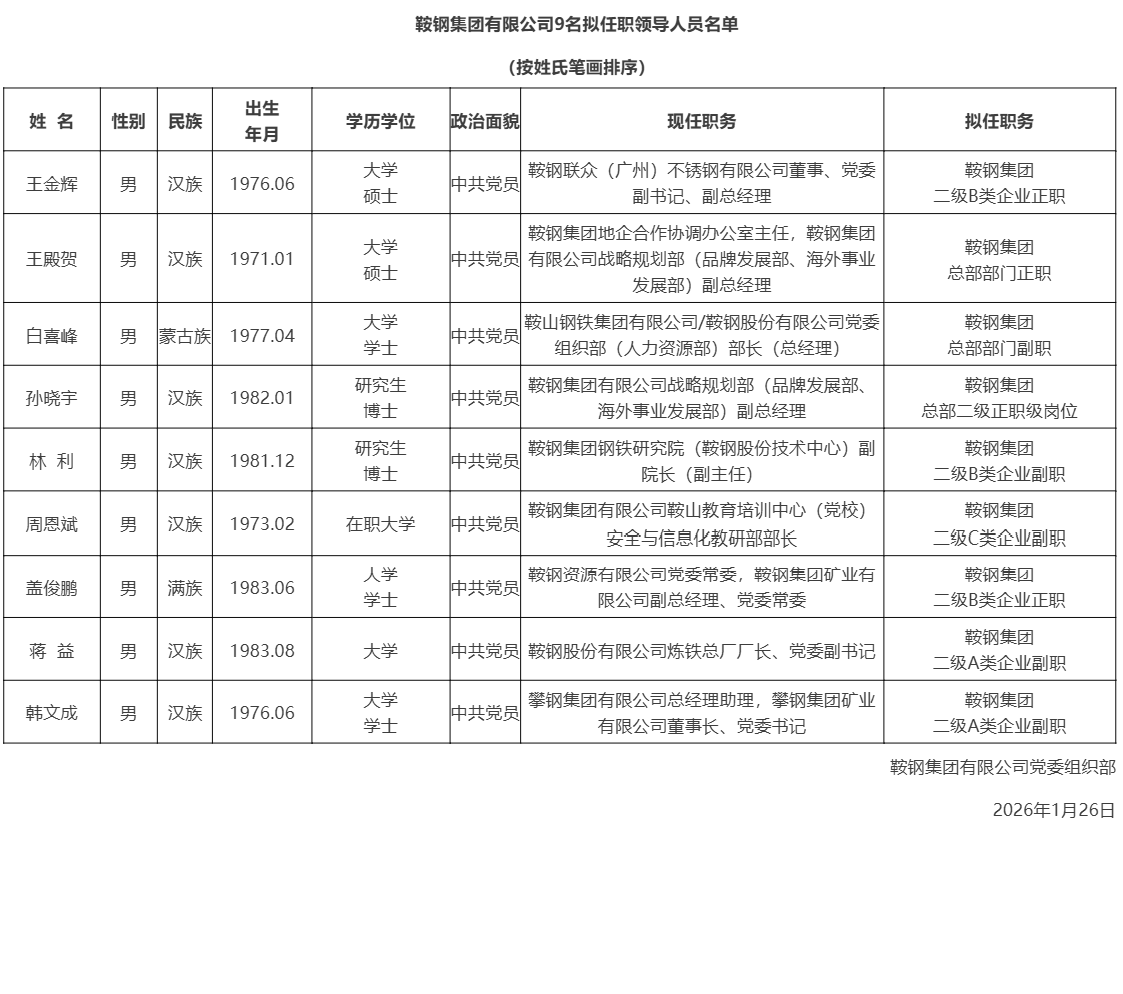 经鞍钢集团有限公司党委研究决定,对9名拟任职领导人员面向全公司实施任前公示。公示期间,广大职工对拟任职领导人员在德、能、勤、绩、廉等方面的意见,可采取来信、来电、来访等方式向鞍钢集团党委组织部反映。公示时间:2026年1月27日至2026年2月2日。