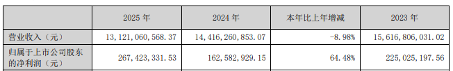 沙钢股份4月23日发布2025年年报。报告显示,公司当年实现营业收入131.21亿元,较上年下降8.98%;归属于上市公司股东的净利润为2.67亿元,同比增64.48%。
