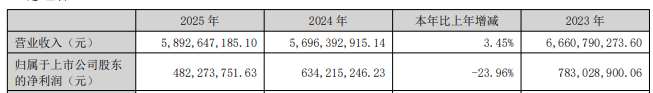 核心提示:常宝股份公告称,公司2025年实现营业收入58.93亿元,同比增长3.45%;归属于上市公司股东的净利润4.82亿元,同比下降23.96%。 主