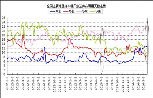 图3:全国主要地区样本钢厂焦炭库存可用天数走势图