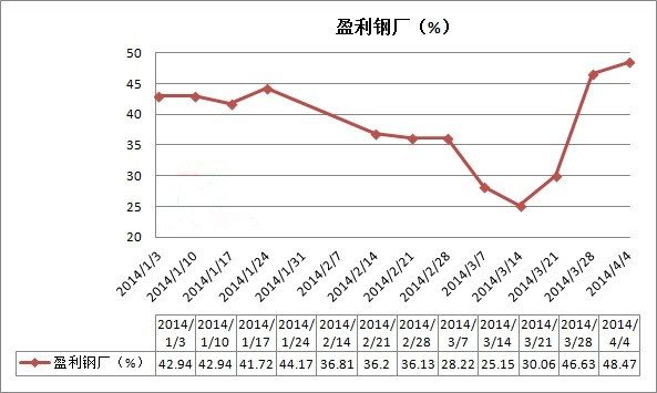最后,据Mysteel对163家样本钢厂调查数据显示,2014年1月到目前为止盈利钢厂所占百分比走势呈现“U”型曲线(如图4显示),截止本周五,盈利钢厂占比为48.47%,较前一周增加1.8%,钢厂盈利面扩大,亏损面逐渐缩小,后期打压原料的力度将放缓。