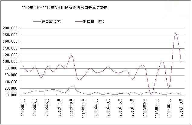 据海关数据显示,2014年3月国内进口钼粉2.423吨,较上月环比减少67.882%;出口钼粉98.994吨,较上月环比减少46.12%。