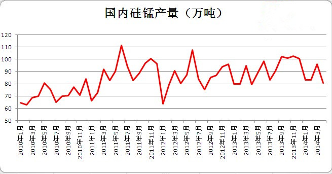 2014年4月国内硅锰产量为80.78万吨,较之3月(95.9万吨)有所下降,较之2013年4月(78.58万吨)略有增加,2014年1-4月累积硅锰产量344.1万吨,较之2013年1-4月(330.7万吨)略增加。