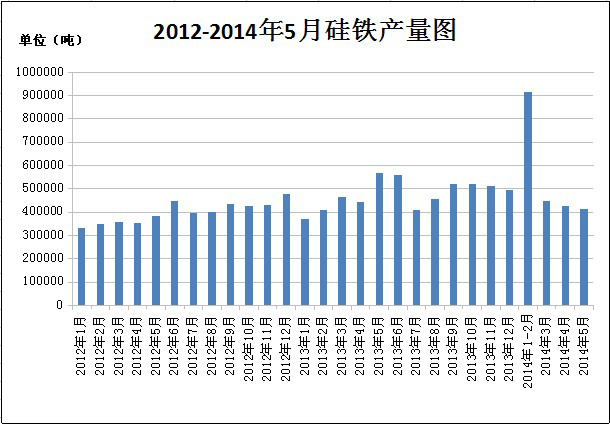 2014年5月我国铁合金产量320.9万吨同比增加28.43万吨,1-5月国内铁合金累计产量为1561.67万吨。2014年5月份我国硅铁产量为41.23万吨,环比4月份小幅减少1.48万吨,其中宁夏7.57万吨、青海8.38万吨、甘肃3.69万吨、内蒙8.33万吨。2014年1-5月份硅铁产量为220.46万吨,同比减少5.77万吨。